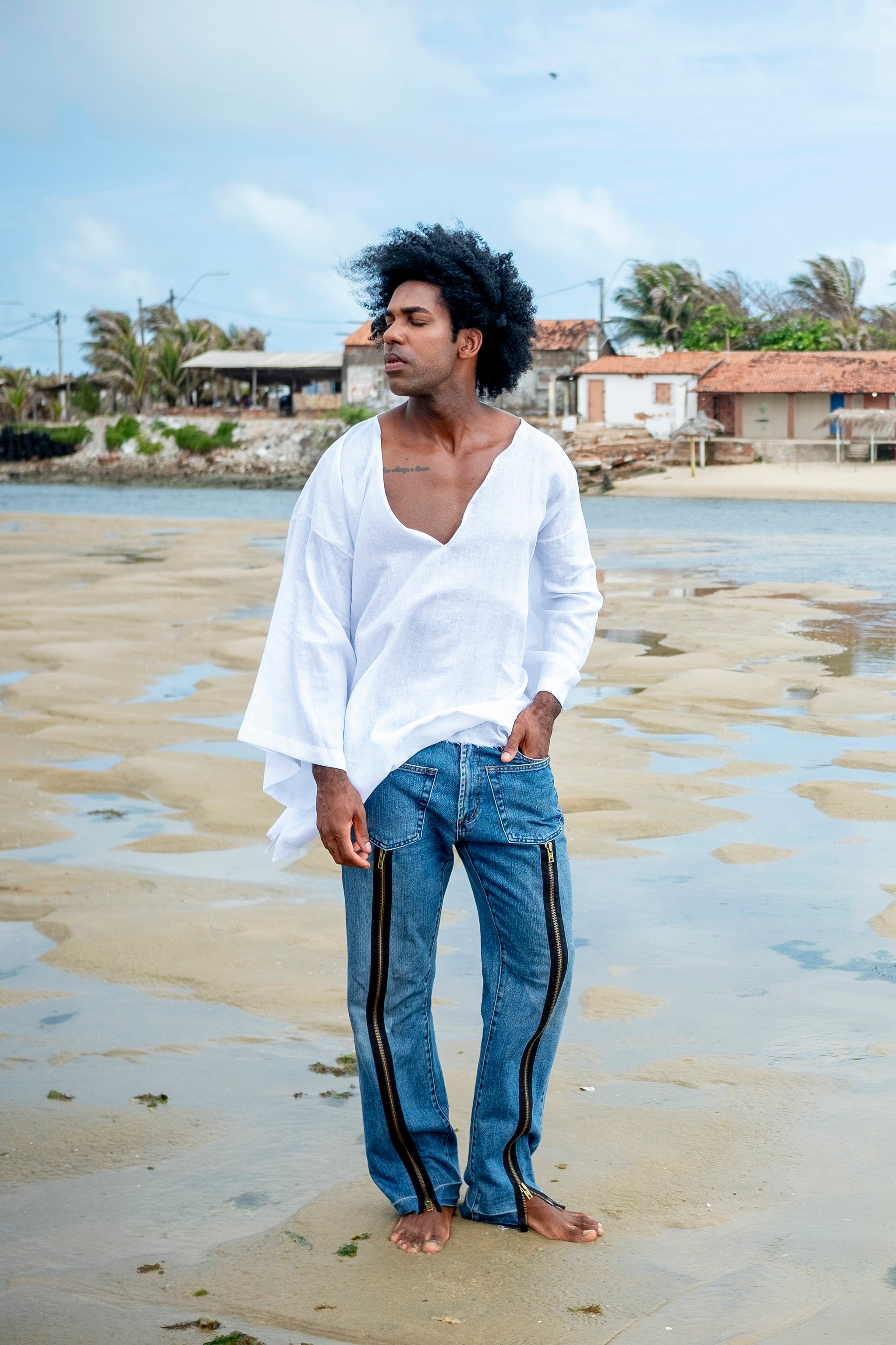 Look complet : Le modèle porte le Jean Free avec la Tunique Free unisexe.