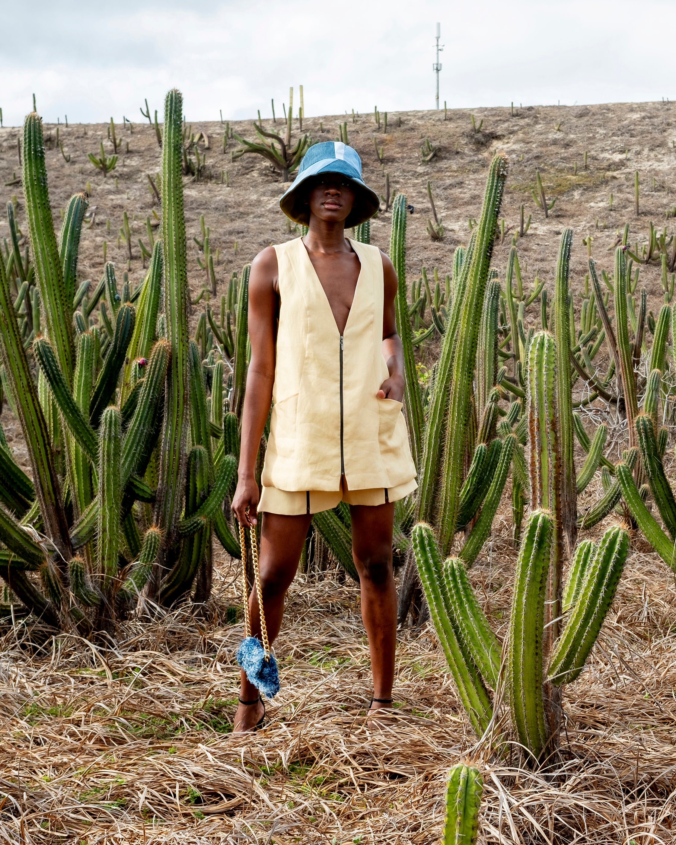 Look complet : La mannequin porte ici la robe-gilet Saïra en lin, associée au Short Saïra et au Chapeau Mirage.